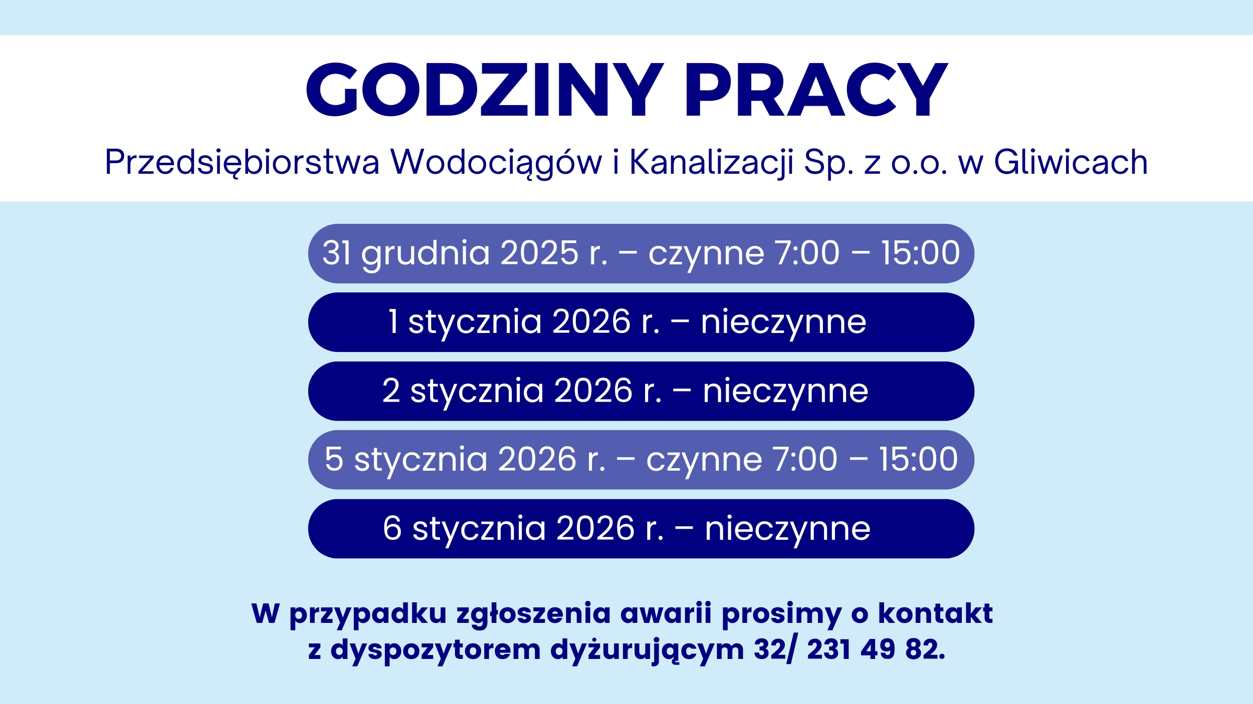 Komunikat dla odbiorców usług PWiK Sp. z o.o. Informujemy, że zgodnie z decyzją Dyrektora Regionalnego Zarządu Gospodarki Wodnej w Gliwicach Państwowego Gospodarstwa Wodnego Wody Polskie, z dniem 11 stycznia 2026 r. rozpocznie się III okres obowiązywania taryf za zbiorowe zaopatrzenie w wodę oraz zbiorowe odprowadzanie ścieków. Zatwierdzone taryfy będą obowiązywać do 10 stycznia 2027 r., na terenie gmin: Gliwice, Pyskowice, Sośnicowice, Zbrosławice, Rudziniec (w gminie Rudziniec – w zakresie zbiorowego zaopatrzenia w wodę). Aktualne stawki oraz szczegółowe informacje dostępne są w na stronie internetowej - Taryfy dla zbiorowego zaopatrzenia w wodę i odprowadzania ścieków